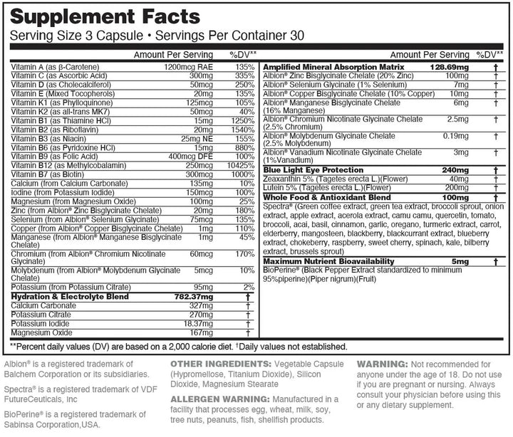 Supercharge your health and vitality with Nutrithority's Whole Food Multivitamin. Fortified with Albion Minerals for optimum absorption, this multivitamin nourishes your cellular health profoundly. Designed for modern living, it’s enriched with Zeaxanthin and Lutein, safeguarding your eyes against blue light exposure. The multivitamin stands out with its incorporation of Spectra, a potent Whole Food Blend, harnessing the power of numerous fruits, vegetables, and herbs to elevate your body’s natural defenses and antioxidant activity. BioPerine further maximizes the absorption, making each capsule a catalyst for enhanced nutrient uptake and overall vitality.